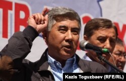 «Азат» ЖСДП жетекшілері Жармахан Тұяқбай (сол жақта) және Болат Әбілов (оң жақта) «қытай экспансиясына» қарсы митингте. Алматы, 28 мамыр 2011 жыл.