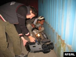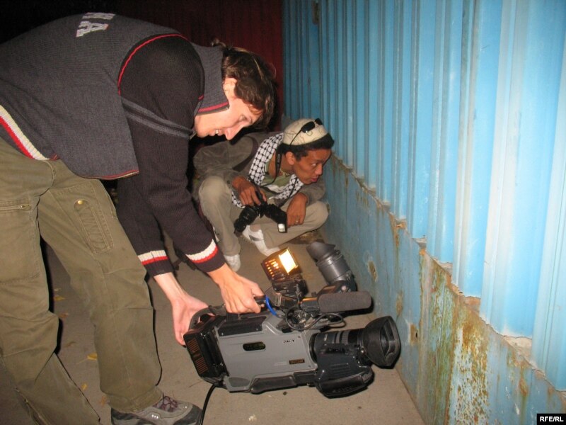 БАҚ өкілдері "Комета S" баспаханасын қақпадағы тесіктен бақылап жатыр. Алматы, 24 қыркүйек 2009 жыл.