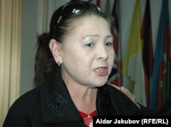 "Желтоқсан-86" ұйымының төрайымы Гүлбахрам Жүніс соңы айғай-шуға ұласқан баспасөз мәслихаты кезінде. Алматы, 27 қазан 2010 жыл