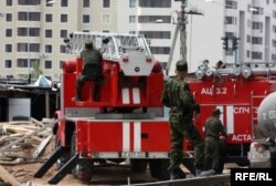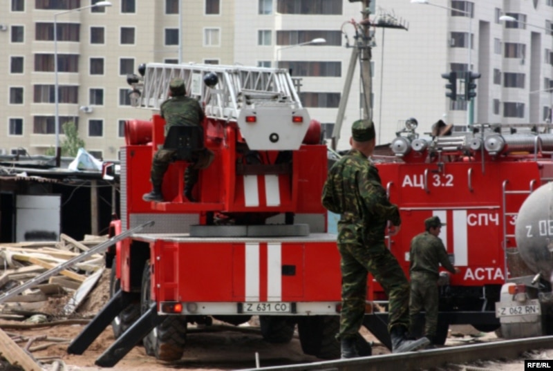 Құтқару, өрт және жедел жәрдем қызметкерлері Г.Әбілова шыққан кран түбінде. Астана, 17 мамыр 2010 ж.