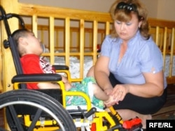 «Балаларды СПИД-тен қорғау» қорының президенті Жанетта Жазықбаева балалар үйіндегі науқас баламен. Шымкент, 22 мамыр, 2010 жыл.