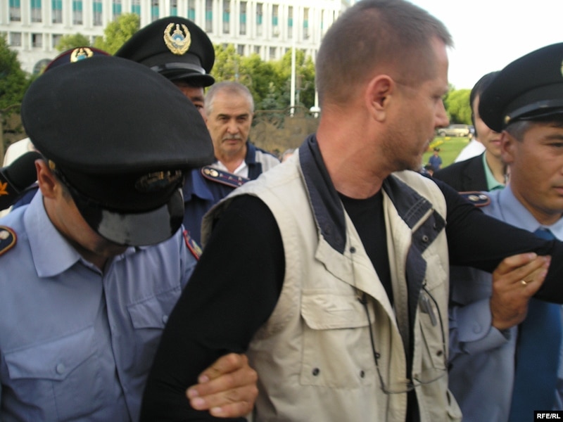 Нұрсұлтан Назарбаевқа президенттік сайлауға шектеусіз түсуіне құқық беретін өзгерістің Конституцияға енгізілуіне қарсылық білдіріп алаңға шыққан журналист Сергей Дувановты полиция ұстап әкетті. Алматы, 24 мамыр 2007 ж.