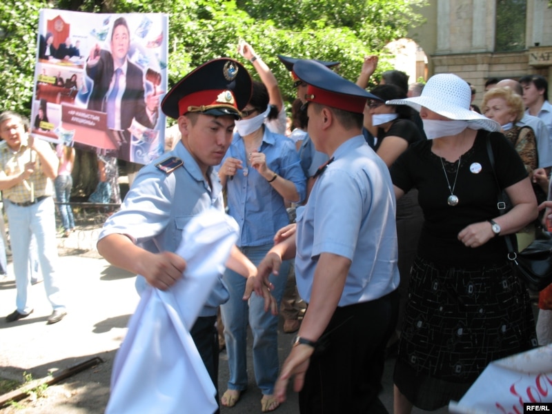 Наразылық акциясына қатысушылардың қолындағы сөз бостандығына қысым жасамау туралы талап айтылған жазуларды полицейлер күштеп жұлып алып жатыр. Алматы, 24 маусым 2009 ж.