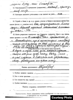 Келесі құжат – тұтқынның анкетасы. Ондағы жазбаларды жоғарыда айтылған өтініштегімен («сұраудағымен») салыстырсақ, онда бұл