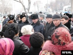 Полициямен бірге осы жерге келген прокуратура өкілі бұның рұқсат етілмеген заңсыз жиын ретінде бағаланып, кінәлілердің жауапқа тартылатынын ескертумен болды. Алайда заң өкілінің бұл ескертуі наразы әйелдерді тоқтата алмады. Бір-бірінің белінен жіппен жалғап байланып алған олар полиция тосқауылын бұзып өтпекке әрекет жасады. Полиция басшыларының бірінің бұйрығы бойынша Ризада Жақыпбекті ұстап, осы жерге алдын-ала әкелінген автобусқа апарып тықты.