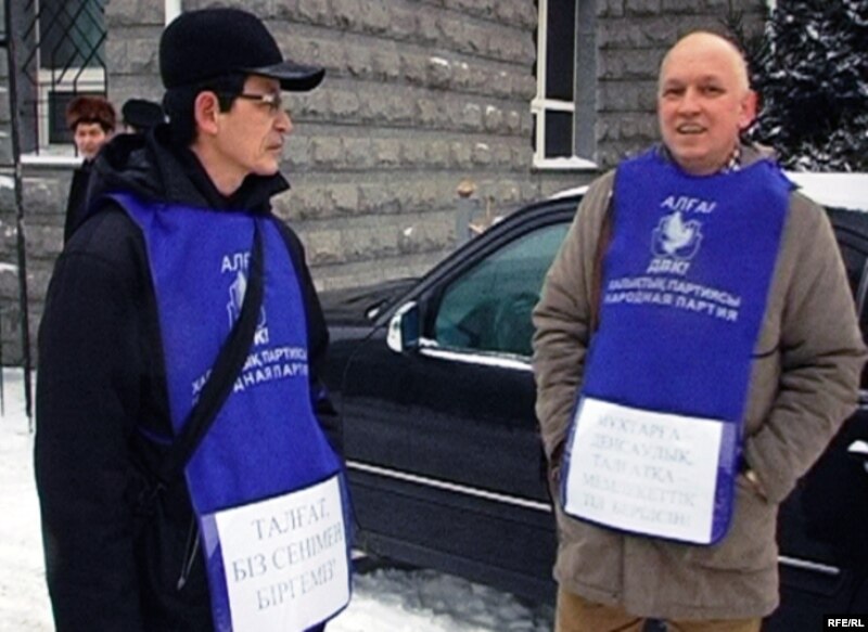 Мұхтар Жәкішевке қолдау танытып наразылық шарасын өткізгендер. Оң жақта тұрған - тіркелмеген «Алға» партиясы үйлестіру кеңесінің төрағасы Владимир Козлов. Астана, 5 қаңтар 2010 жыл.