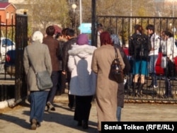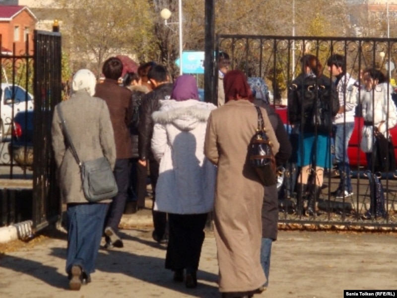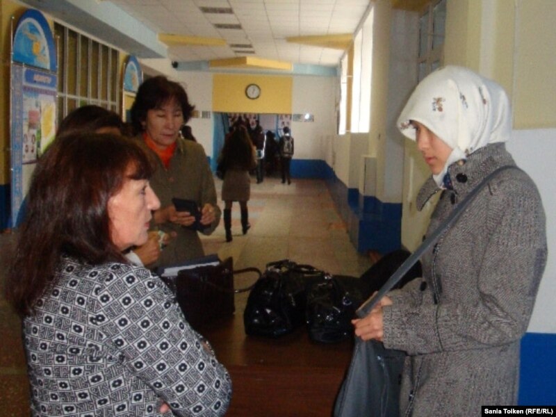 Атырау мемлекеттік университетінде оқитын мұсылман қыздар хиджаб кигендері үшін сабаққа кіре алмай кетіп барады. 12 қараша 2010 жыл.