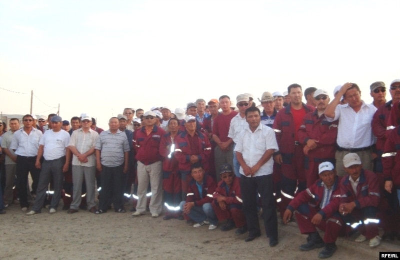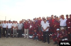 «Жайықмұнайгаз» компаниясының ондаған мұнайшысы аштық жариялап жатқан он жұмысшыға қолдау ретінде жұмысты тоқтатты. Аққыстау ауылы, Исатай ауданы, Атырау облысы. 3 шілде 2010 жыл.