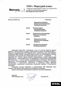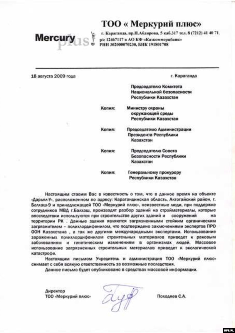 «Балқаш-9» нысанын жұрт бұзып алып жатқандығы туралы «Меркурий Плюс» фирмасының бұрынғы директоры Сергей Походяевтің жазған арыз-хаты.