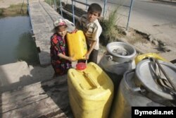 Тәжікстан астанасында су құйылған ыдысты қоларбаға салып келе жатқан бала. Душанбе, маусым, 2008 жыл.