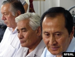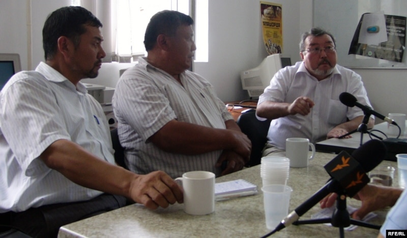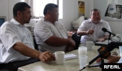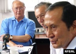 Мәдениеттанушы Мұрат Әуезов (сол жақта) және ұйғыр қауымдастығының мүшелері Аруп Мусабаев (ортада) пен Қаһарман Қожамберді Азаттықтың Алматыдағы бюросында өткізілген дөңгелек үстел отырысында. 9 шілде 2009 жыл.