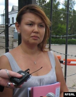 «Казатомпром» компаниясының тұтқынға алынған бұрынғы басшысы Мұхтар Жәкішевтің зайыбы Жәмила Жәкішева ҰҚК-нің тергеу абақтысы алдында журналистерге сұхбат беріп тұр. Астана, 4 маусым 2009 ж.