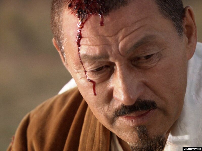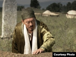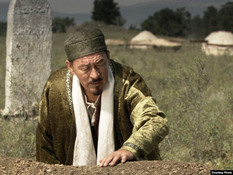 Біржан сал (актер Досхан Жолжақсынов) әйелі Әпіштің моласының басында. «Біржан сал» фильмінен көрініс.