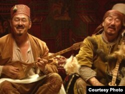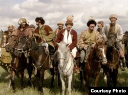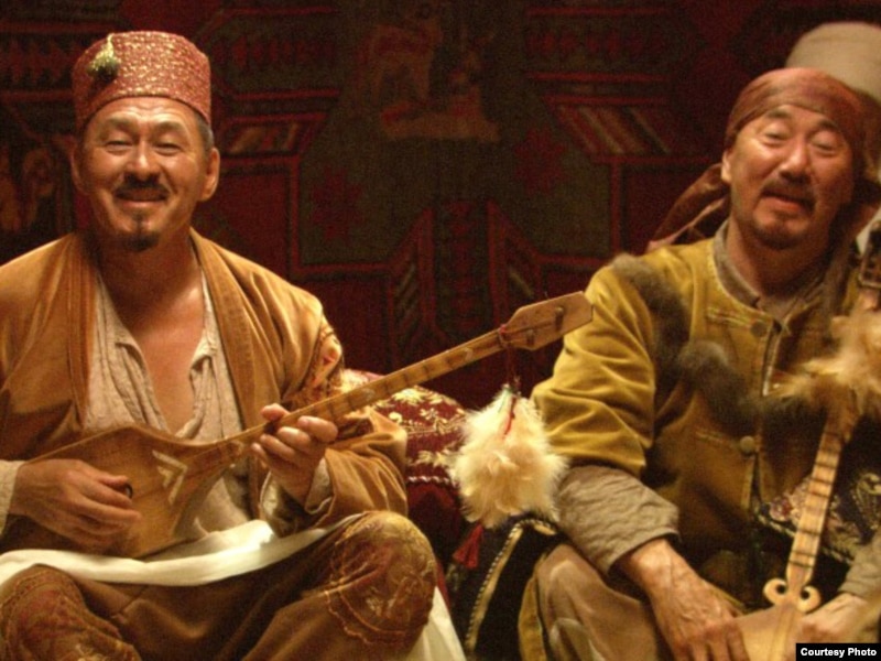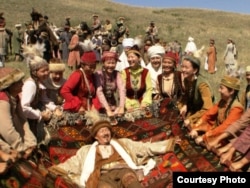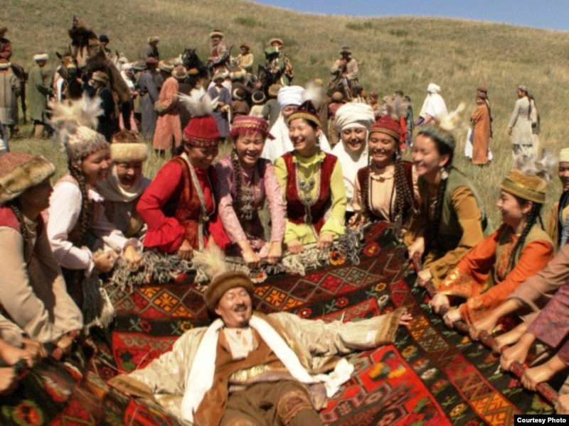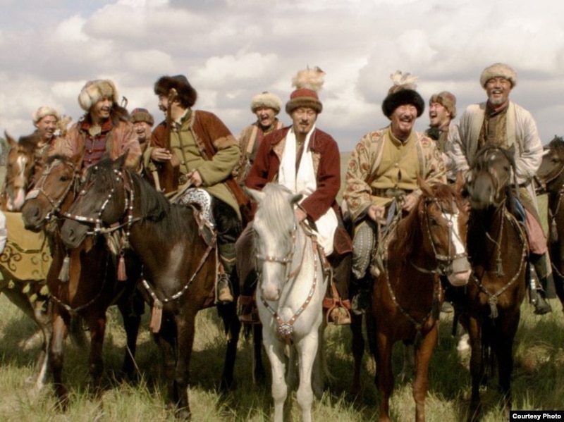 Біржан сал (актер Досхан Жолжақсынов) қазақ сал-серілерінің ортасында. «Біржан сал» фильмінен көрініс.