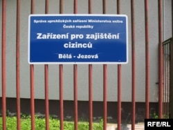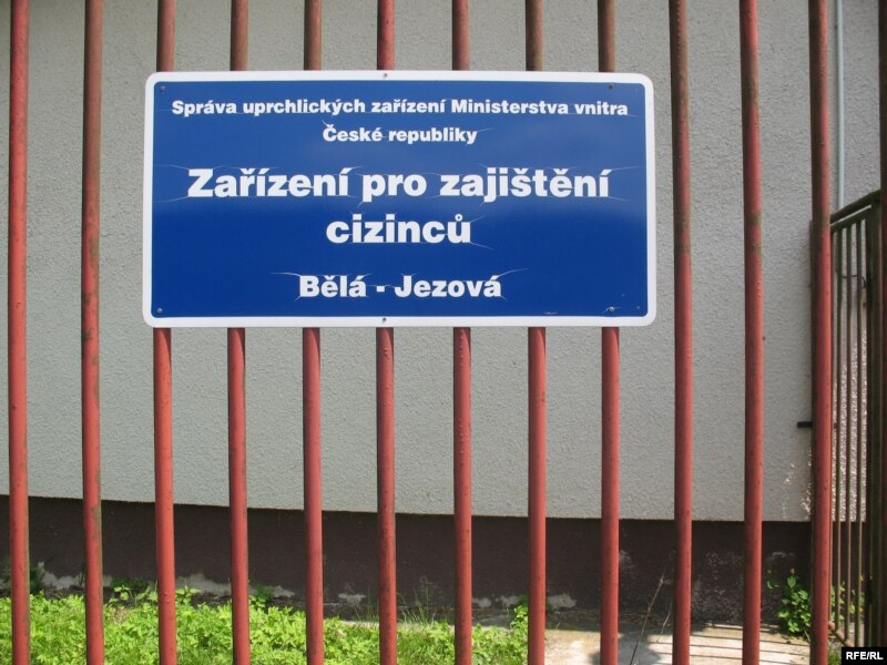 "Бела Йезова" босқындар лагерінің сыртқы қоршауында: «Шетелдіктерді орналастыруға арналған мекеме» деп жазылған.