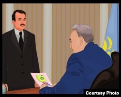 «Сапа Олимпиадасы» мультфильмінен көрініс: Қазақстан президенті Нұрсұлтан Назарбаев пен премьер-министр Кәрім Мәсімов. «Жебе» киностудиясының суреттері.