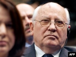 АҚШ президенті Барак Обаманың Жаңа экономика мектебінде сөйлеген сөзін тыңдағандардың арасында бұрынғы Совет Одағының президенті Михаил Горбачев (оң жақта) те болды. Мәскеу, 7 шілде 2009 жыл.