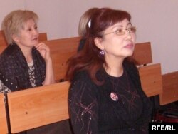 «Журналистер қауіп-қатерде» қорының президенті Розлана Таукина (оң жақта) және түрмеде отырған журналист Рамазан Есіргеповтың зайыбы Раушан Есіргепова (сол жақта) сот залында. Алматы, 27 қаңтар 2010 жыл.