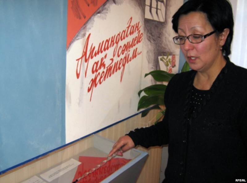 Қайнигүл Ерахметова, Алматыда 1986 жылғы Желтоқсан оқиғасына қатысқан Қайрат Рысқұлбековтың атындағы мектеп директорының орынбасары, мектеп мұражайындағы Қайраттың галстугін көрсетіп тұр. Семей, желтоқсан, 2009 жыл.