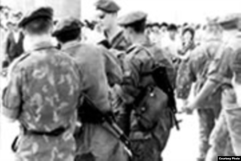 1989 жылдың маусымындағы Жаңаөзендегі халық толқуына қарсы арнайы жасақ қимылдауда. «Витязь» арнайы тобының ардагерлер кеңесінің сайтындағы (http://osn.bkb-vityaz.ru) сурет. Сайтта: «Арнайы жасақ тыныштық кепілі бола білді» деп жазылған.