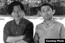 Ақын Жұмекен Нәжімеденов (сол жақта) композитор Шәмші Қалдаяқовпен бірге, Алматы, 1963 жыл. Жеке мұрағаттағы сурет.