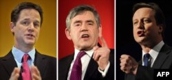 Солдан оңға қарай либерал-демократ Ник Клегг, премьер-министр лейборист Гордон Браун және консерватор Дэвид Камерон