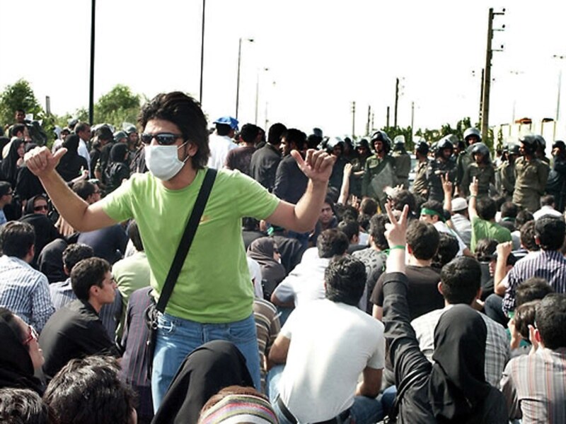 Сайлау нәтижесіне наразылық танытушы шерушілердің ішіндегі жас демонстрант белгі беріп тұр. Тегеран, 30 шілде 2009 жыл