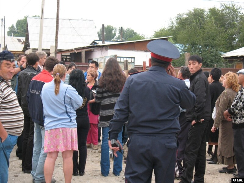 Үйлерін заңдастыра алмай жүрген тұрғындардың жиыны полиция бақылауында. Алматы, 17 қыркүйек, 2009 жыл.