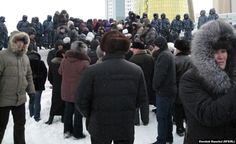Үлескерлер мен ипотека борышкерлері президенттікке кандидат Нұрсұлтан Назарбаевпен кездесуді талап етіп жиналды. Астана, 15 наурыз 2011 жыл.