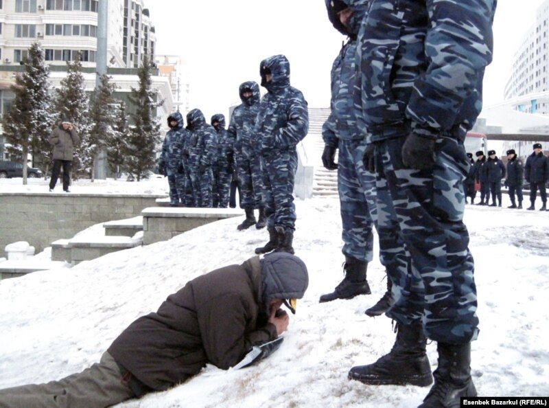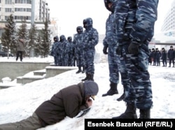 Акцияға қатысушылардың бірі әкімшілік ғимаратқа барар жолды бөгеген полиция қызметкерінің алдында қарда жатыр. Астана, 15 наурыз 2011 жыл.