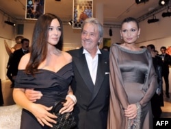 Солдан оңға: италиялық актриса Моника Беллучи, француз киноактері Ален Делон және Лола Каримова. Париж, 8 сәуір 2009 жыл.