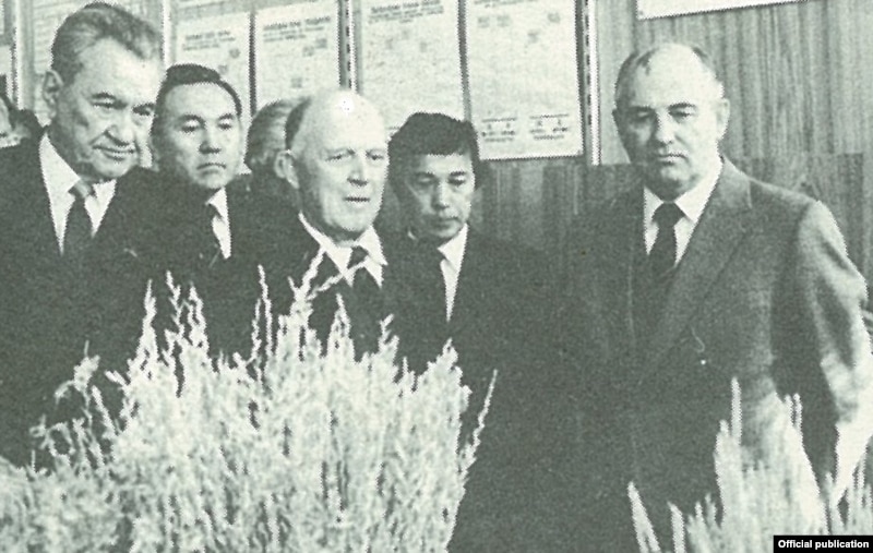 Қазақстан Компартиясы ОК-нің бірінші хатшысы Дінмұхамед Қонаев, Қазақ ССР Министрлер кеңесінің төрағасы Нұрсұлтан Назарбаев (сол жақ шеткі), СОКП ОК бас хатшысы Михаил Горбачев (оң жақ шеткі). Целиноград, 1985 жыл.