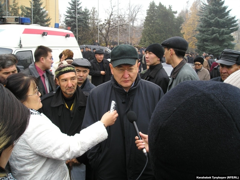Алтынбек Сәрсенбайұлы марқұм Заманбек Нұрқаділовті ақтық сапарға шығарған күні сұхбат беріп тұр. Үш айдан соң Сәрсенбайұлының өзі де қастандық құрбаны болды. Алматы, 15 қараша, 2005 жыл.