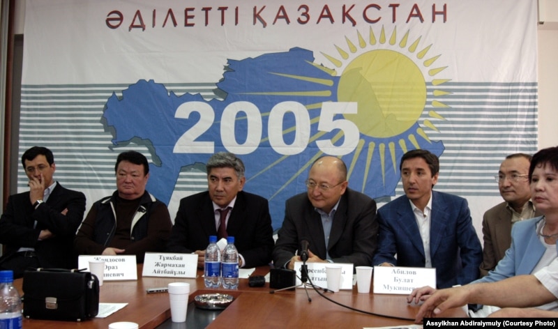 Қазақ оппозициясы қайраткерлері «Әділетті Қазақстан үшін» қозғалысының жиынында отыр. Солдан оңға қарай: Ораз Жандосов, Заманбек Нұрқаділов, Жармахан Тұяқбай, Алтынбек Сәрсенбайұлы, Болат Әбілов, Асылбек Қожахметов және Гүлжан Ерғалиева. Алматы, 2005 жыл.