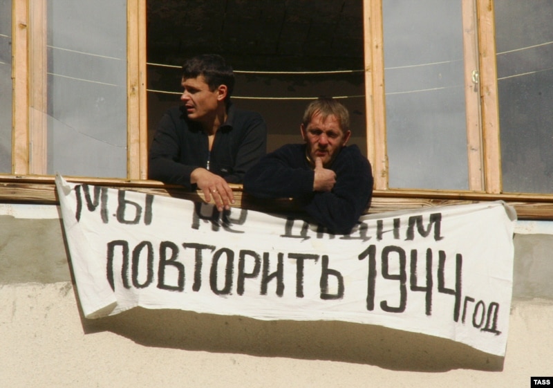 Пәтерлерінен шығарылып жатқан Қырым татарлары "Біз 1944 жылдың қайталануына жол бермейміз!" деп наразылық танытып тұр Алушта, 16 қараша, 2001 жыл.