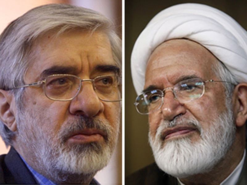 Оппозициялық Жасылдар қозғалысының жетекшілері Мир-Хосейн Мусави (сол жақта) мен Мехди Карруби. Тегеран.