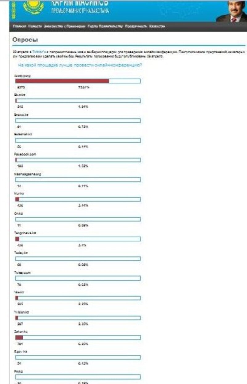 Өткен аптада Қазақстан премьер-министрі Кәрім Мәсімовтің Twitter желісіндегі жеке парағында онлайн-конференция өткізуге қажет веб-сайт іздеген хабарландыруы жарияланды. «Көп ұсыныс түсті, белсенділіктеріңізге ризамын. Бүгін менің ресми сайтым pm.kz-де онлайн-конференцияны өткізу алаңы үшін дауыс беру басталады. Дауыс беру нәтижесі 28-сәуірде жарияланады» деп жазған еді премьер-министр.