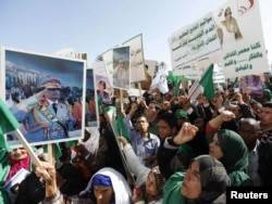 Триполиде үкіметті жақтаушылар Муаммар Каддафидің суретін ұстап шеру өткізді. Ливия, 17 ақпан 2011 жыл.
