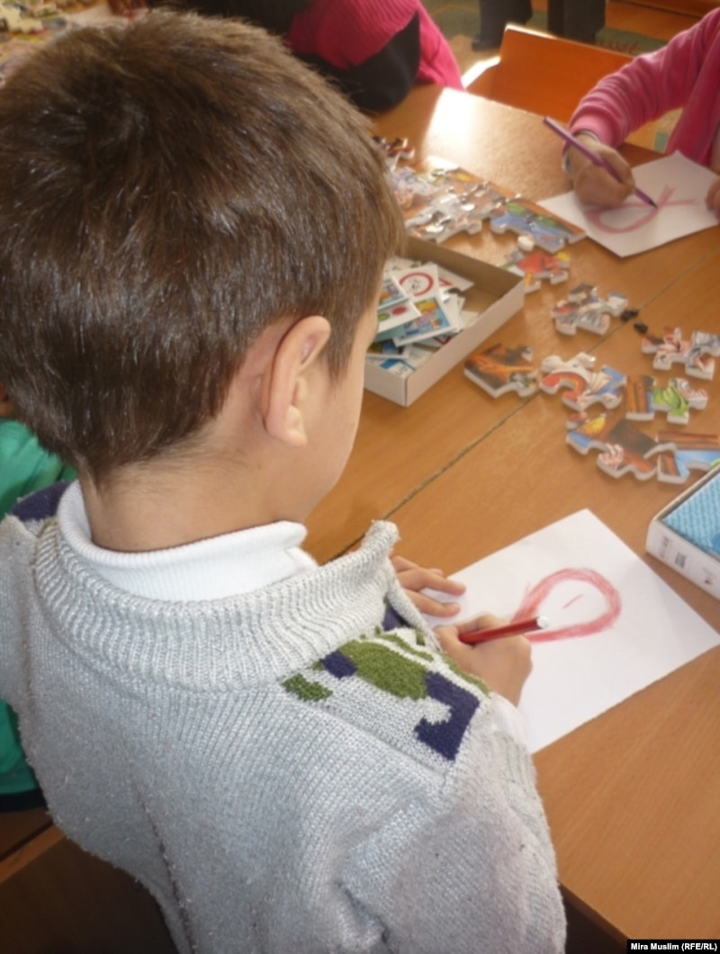 ВИЧ дертіне шалдыққан ұл бала СПИД-ке қарсы күрес белгісінің суретін салып отыр, «Ана мен бала» орталығы, Шымкент, 30 қараша, 2010 жыл.