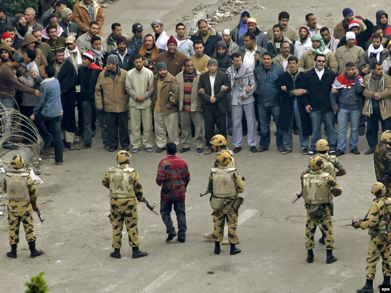 Ал президентті қолдайтындар ақпанның 2-і наразылық танытушыларды алаңнан тас, жанғыш сұйықтығы бар бөтелке қолданып, оқ ату арқылы қуып шығуға ұмтылғанда қарсылыққа қатысты пікірлер түрлене түсті. Тахрир алаңында наразылық танытушылар қолға ілінген заттың бәрімен қорғанып бақты. Наразылық танытушылар әскерилердің оқ атпайтындығы жайлы уәдесін алды. Толқуларда Египет әскерінің рөлі құпия және екіұшты болғанымен, көптеген египеттіктер әскерилер берген уәдесінде тұрады деп сенді. Тахрир алаңындағы халықты күшпен таратуды көздейтін кез-келген шара халықаралық қауымдастық тарапынан сынға ұшырауы мүмкін еді дегенді айтады Reuters.
