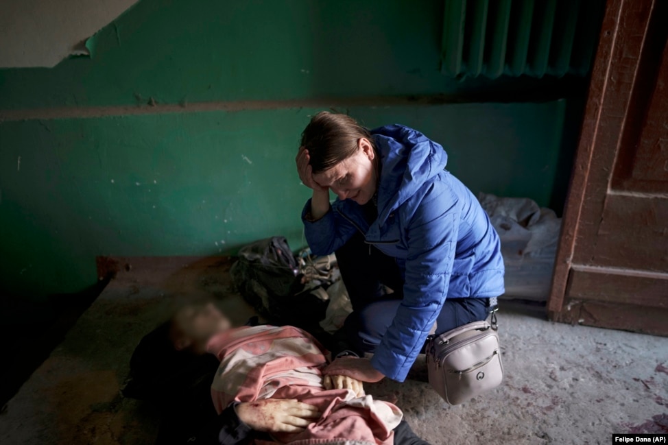 Оксана Колесникова Ирпендегі шайқаста қаза болған отыз жастағы Анатолий Колесниковтің мәйітінің жанында отыр. 15 сәуір 2022 жыл.