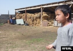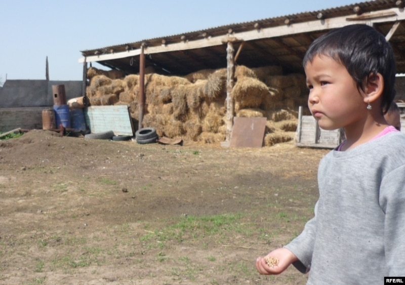 Шарапхана ауылында тұратын 4 жасар Меруерт Қожаханова үй ауласында тауықтарға жем шашып жүр. Оңтүстік Қазақстан облысы, Қазығұрт ауданы, 10 сәуір 2010 жыл.