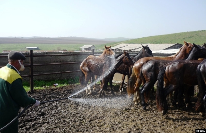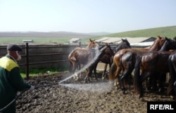 Жылқы түлігін кенеге қарсы сұйық дәрімен залалсыздандыру жұмыстары жүргізілуде. Оңтүстік Қазақстан облысы, Қазығұрт ауданы, 10 сәуір, 2010 жыл.