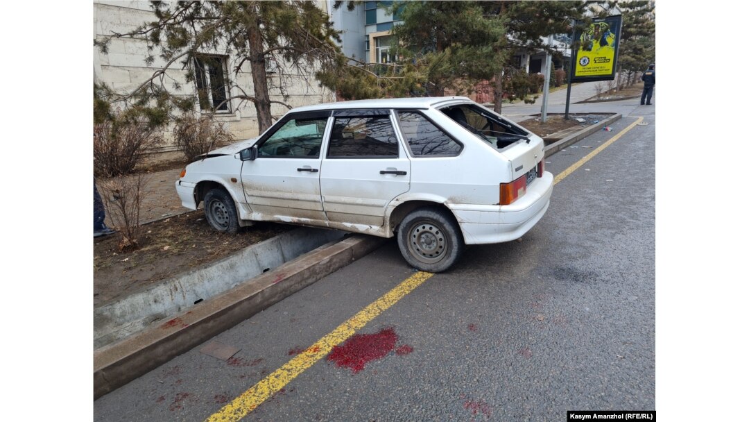 Назарбаев даңғылы бойында көп оқ тиіп, талға соғылып тоқтаған жеңіл автокөлік. Алматы, 7 қаңтар, 2022 жыл.