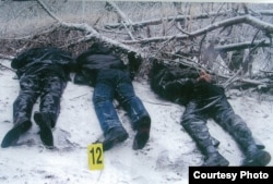 Кісі қолынан өлген белгілі саясаткер Алтынбек Сәрсенбайұлы мен оның екі көмекшісі – Бауыржан Байбосын және Василий Журавлевтің денелері. Алматы маңы, 13 ақпан 2006 жыл. (Сурет Рахат Әлиевтің "Өкіл қайын ата" кітабынан алынды).