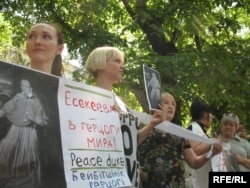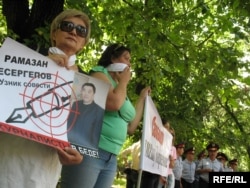 Тараз сотында айыпталып отырған "Алма-Ата инфо" газетінің бас редакторы Рамазан Есіргеповтың зайыбы Раушан (сол жақта) наразылық акциясында. Алматы, 24 маусым 2009 ж.