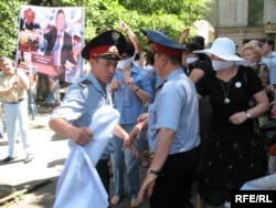 Акцияға қатысушылардың қолындағы сөз бостандығына қысым жасамау туралы талап айтылған жазуларды полицейлер күштеп жұлып алып жатыр. Алматы, 24 маусым 2009 ж.